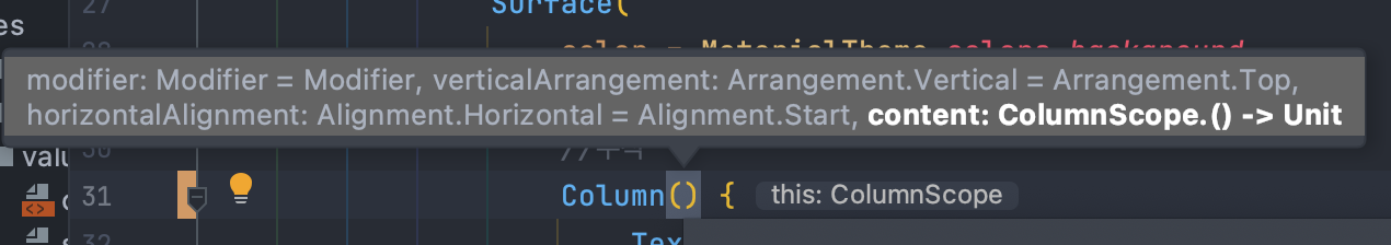 Column은 수직으로 나타내는데, 단순히 수직으로 나타내기 위해선 ( )를 안적어줘도 되지만, 위의 코드처럼 modifier를 이용해서 배경색이나 가운데정렬, 등 나타내기 위해서는 괄호를 적어주어 변경할 내용들을 적어주어야한다.