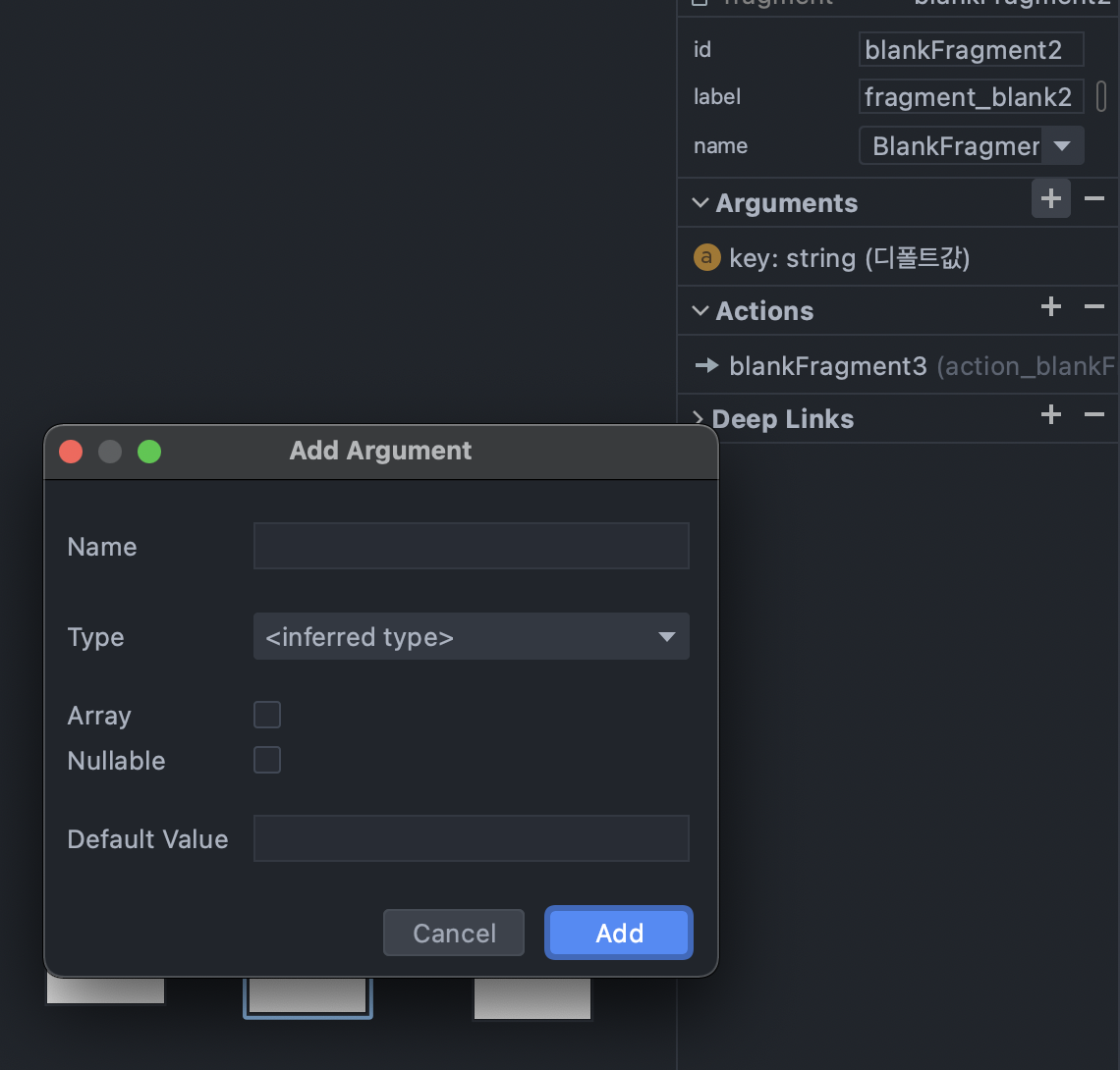 네비게이션 파일에 들어가 데이터를 받는 프래그먼트에서 Arguments를 클릭하여 디폴트값을 설정할 수있다.