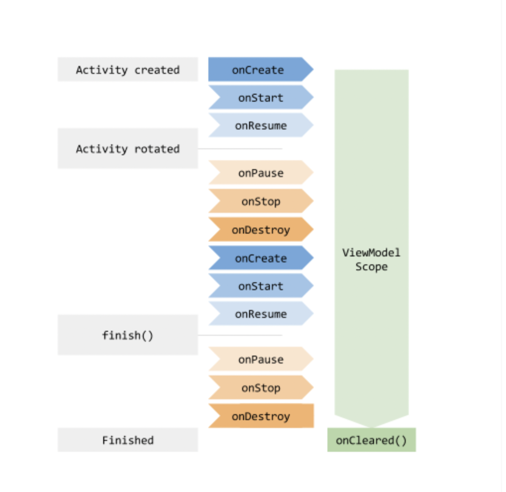 위 그림을 살펴보면 액티비티랑은 독립된 생명주기를 가지고 있다. 따라서 액티비티가 재 생성되는 동안에도 값을 유지하고 가지고 있을 수 있다.