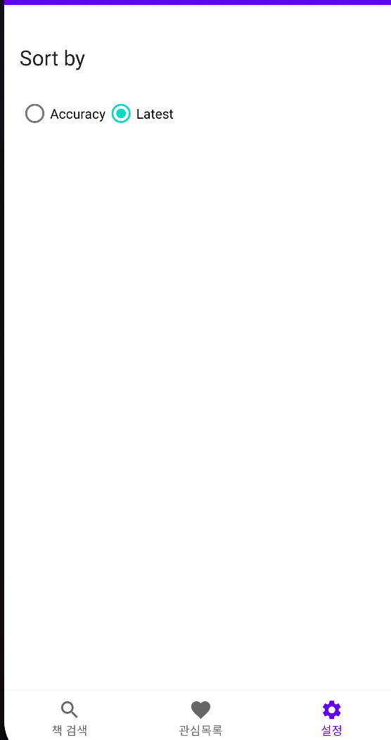 이제 책 정렬 방식을 정확도순으로 할 것인지, 최근 순으로 할 것인지 DataStore에 저장해두고, 앱을 다시 시작했을 때
