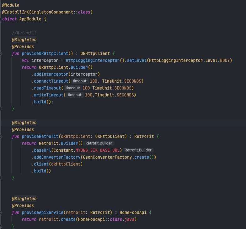 Hilt 주입으로 인해 앱 모두에서 사용하기 위한 싱글톤으로 생성하였고, 따라서 다음과 같이 Factory를 주석처리하였다. Hilt주입으로 인해 코드가 더욱 간결해지고, 유지보수를 더욱 쉽게 하고 있으며, 추 후에 테스트코드를 작성할 때에도 조금 더 편리하게 작성할 수 있게 되었다.