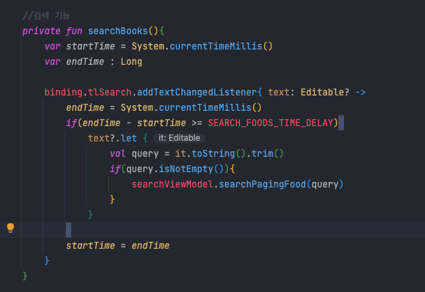 검색창에 사용자가 입력할 때 마다 입력한 시간을 endTime으로 그 전에 입력했던 시간을 startTime으로 초기화 한 뒤, 검색 api를 비동기적으로 호출하였다. 다음은 검색 기능에 대한 Paging 처리 코드이다.