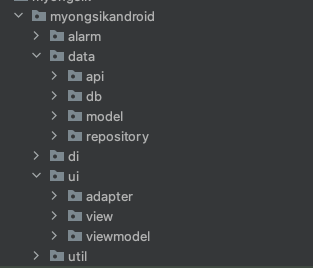먼저 백그라운드 작업을 하기 위한 alarm, API 통신, Room, Repository 등 관련 데이터, 의존성 주입을 위한 di, ViewModel, View, Adapter 등 뷰와 관련된 ui, 앱 공통으로 사용될 util, 패키지로 구성하여 MVVM 패턴을 사용하였다.