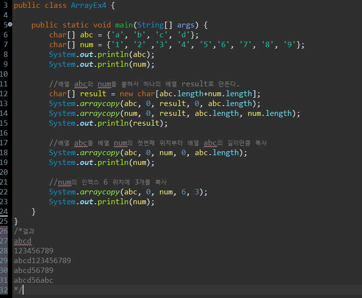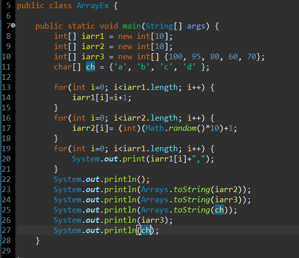 하지만 27라인처럼 char배열은 println메소드로 출력하면 각 요소가 구분자 없이 그대로 출력되는데,
