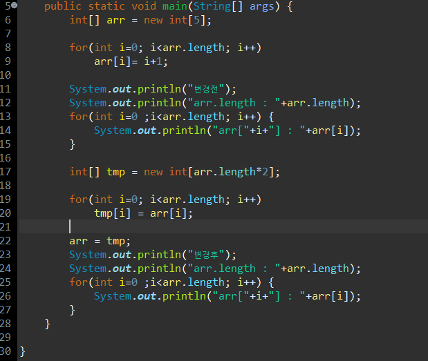 그리고 arr=tmp에 의해 참조변수 arr과 tmp는 같은 배열을 가르키게 된다.