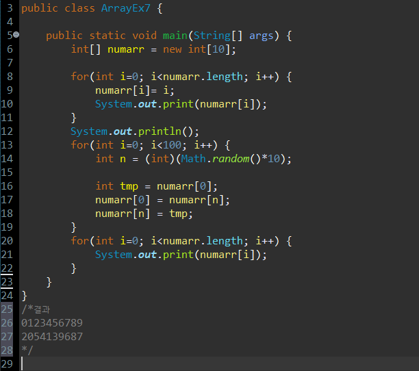 이 작업을 반복적으로 수행하면 배열 numarr의 값들이 뒤섞이게 된다.