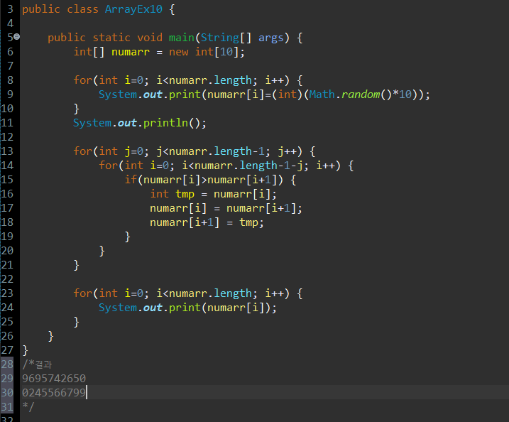 먼저, 길이가 10인 배열에 0과 9사이의 임의의 값으로 채운다음, 크기순으로 정렬하는 예제이다.