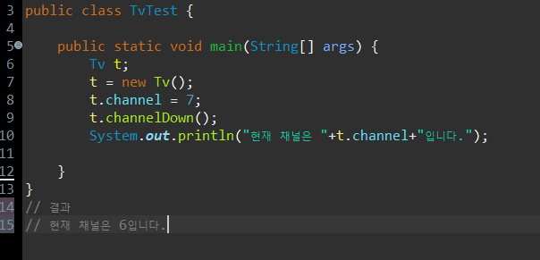 참조변수 t에 저장된 주소에 있는 인스턴스의 멤버변수 channel에 7을 저장한다.