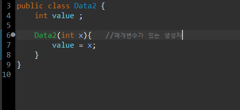 Data2에는 이미 생성자 Data2(int x)가 정의되어 있으므로 기본생성자가 추가되지 않았기 때문이다.