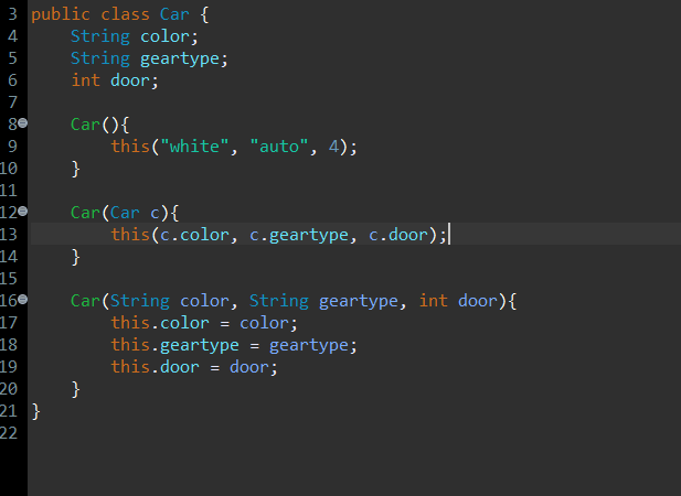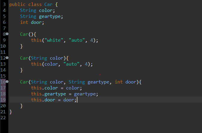 생성자 Car()에서 또 다른 생성자 Car(String color, String geartype, int door)를 호출하였다.