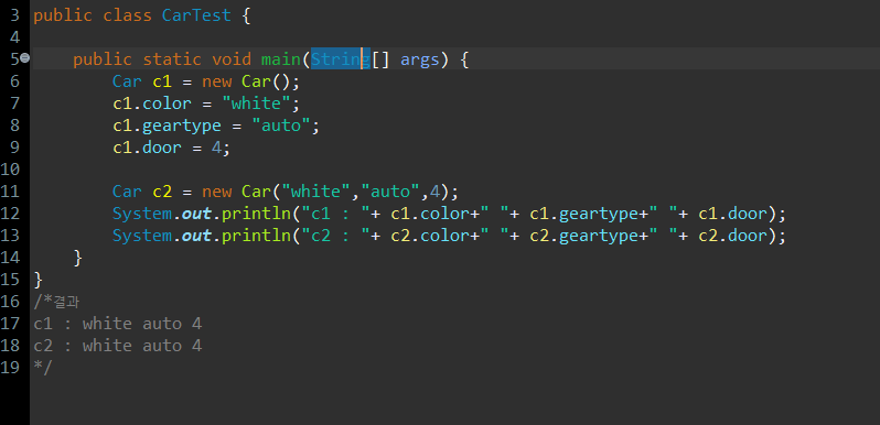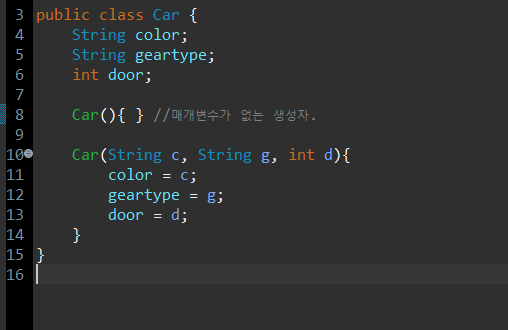 매개변수가 없는 생성자를 생성하여 c1.color = "whtie", c1.geartype = "auto" 등 각각 설정 해줄수 있지만,