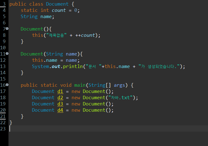 Document클래스의 인스턴스를 생성할 때 마다 생성자가 수행되어,
