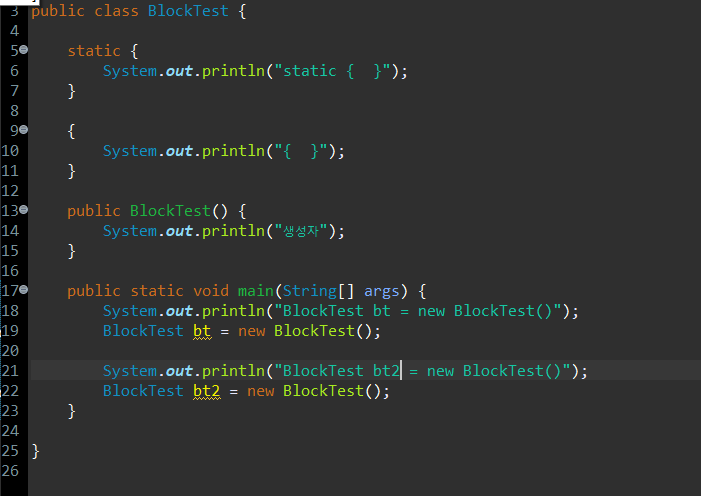 예제가 실행되면서 BlockTest가 메모리에 로딩될 때, 클래스 초기화 블럭의 가장먼저 수행된다.