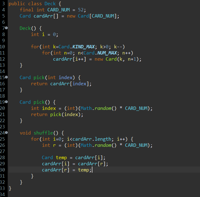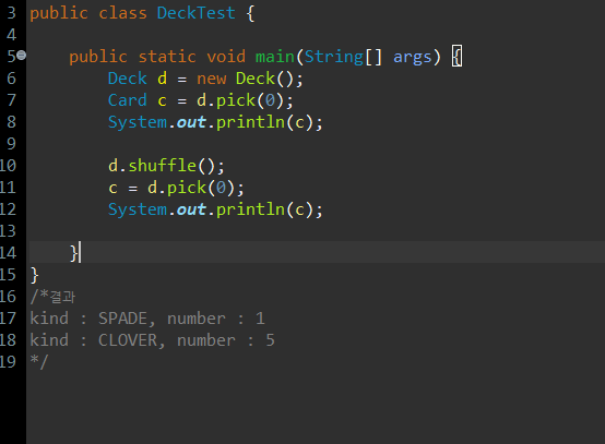 Deck클래스를 작성하는데 Card클래스를 재사용하여 포함관계로 작성하였다.