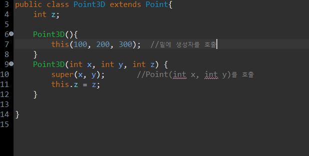 Point3D클래스의 생성자를 보면 첫 줄이 생성자(조상의 것이든 자신의 것이든)를 호출하는