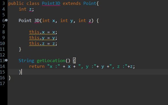 이 두 클래스는 서로 상속관계에 있으므로 Point3D클래스는 Point클래스로부터 getLocation()을 상속받았지만,