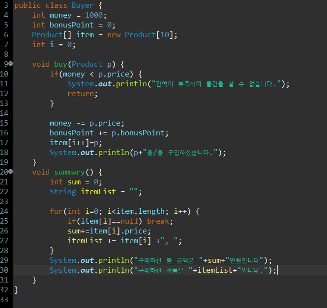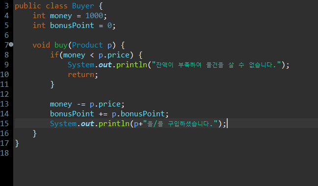 Buyer클래스에 물건을 구입하는 기능의 메소드를 추가한다고 가정하면,