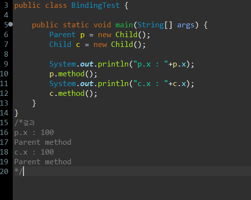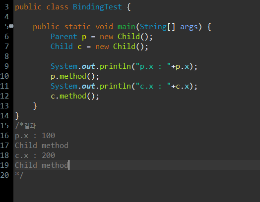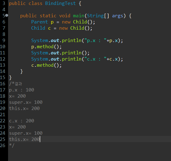 메소드인 method()의 경우 참조변수의 타입에 관계없이 항상 실제 인스턴스의 타입인 Child클래스에 정의된 메소드가 호출되지만, 인스턴스변수인 x는 참조변수의 타입에 따라 달라지는 것을 알 수 있다.