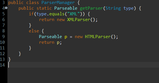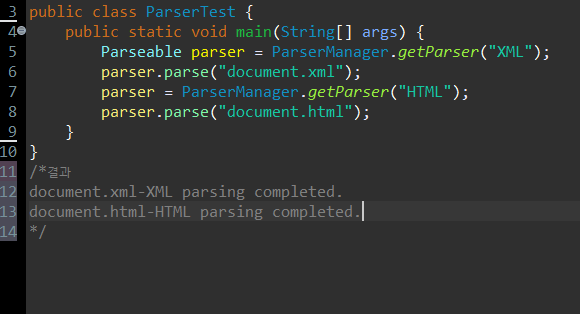 따라서 Parseable parser = ParserManger.getParser("XML"); 은