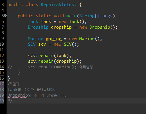 Marine은 Repairable인터페이스를 구현하지 않았으므로 SCV클래스의 repair메소드의 매개변수로 Marine을 사용하면