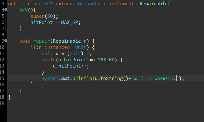 앞으로 새로운 유닛이 추가되어 클래스를 추가할 때, SCV의 repair메소드에 의해서 수리가 가능하도록 하려면