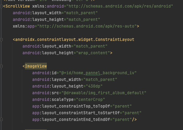 첫 뷰를 ScrollView로 설정하고, 그 안에 해당되는 레이아웃은 위의 코드처럼 ConstrainLayout으로 설정하였다.