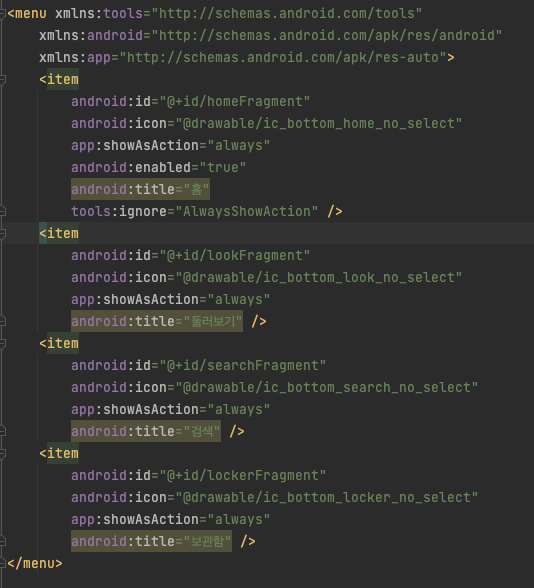 다시 메인액티비티.xml파일로 가서 바텀네비게이션에 menu.xml파일을 추가해주어 연결해주자.