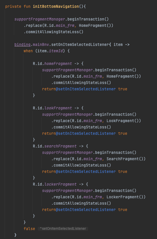 binding을 통하여 바텀네비게이션에 접근해 준 다음 setOnItemSelectedListener로 프래그먼트를 선택한다.