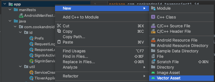 2. 프로젝트 창에서 app -> new -> Vector Asset을 클릭한다