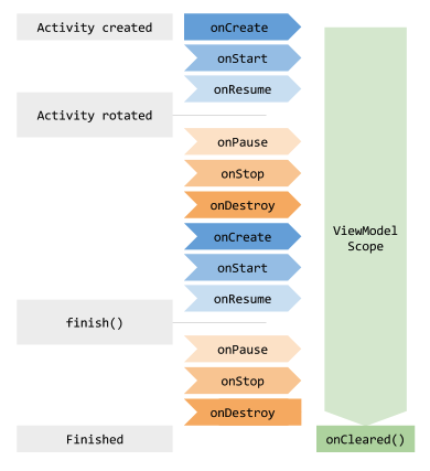 위의 그림과 같이 액티비티가 시작되고, 종료될 때 까지 뷰모델은 유지된다.
