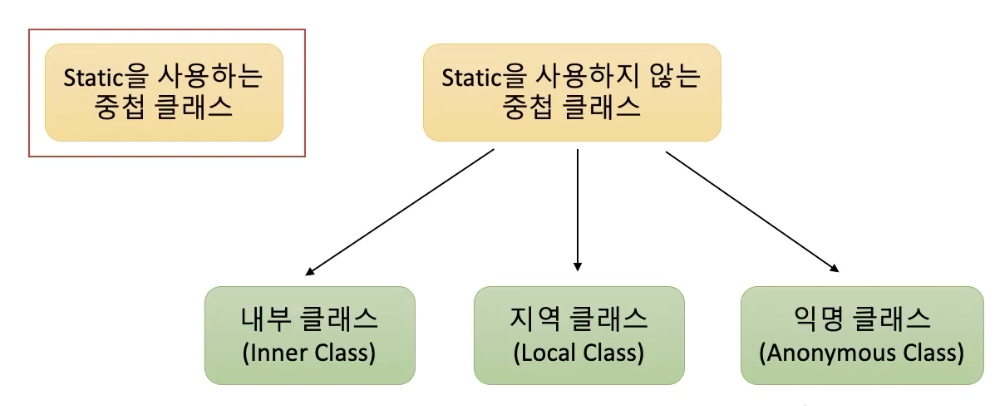자바에서 static을 사용하는 중첩클래스와 사용하지 않은 클래스 두 가지로 나눌 수 있었다.