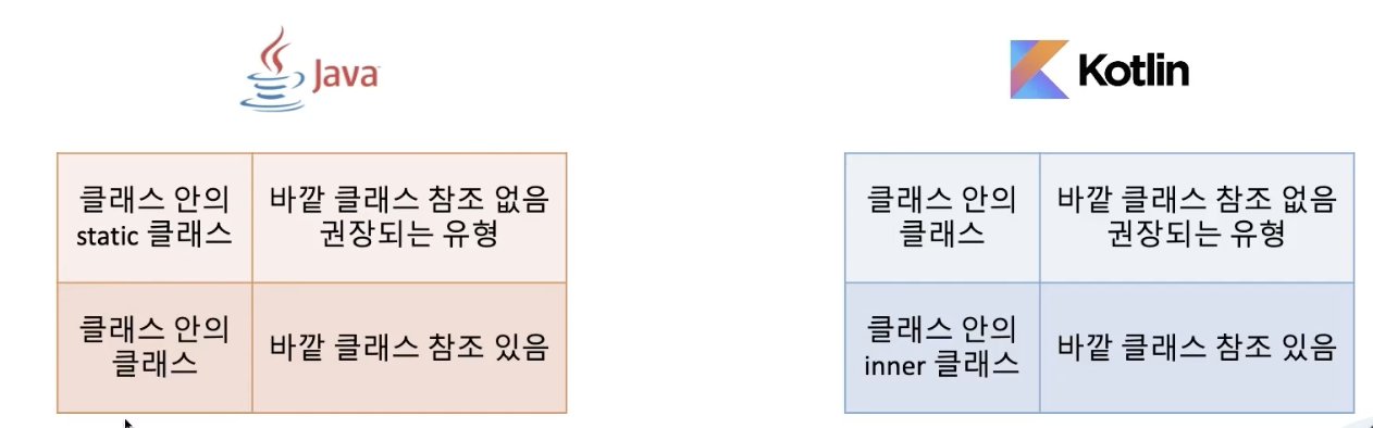 코틀린에서의 내부클래스는 그냥 클래스 만들듯이 편하게 작성하면된다.