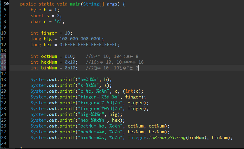 정수형의 경우, long타입의 리터럴에 접미사 l또는 L을 붙이고, 접미사가 없으면 int타입의 리터럴이다.